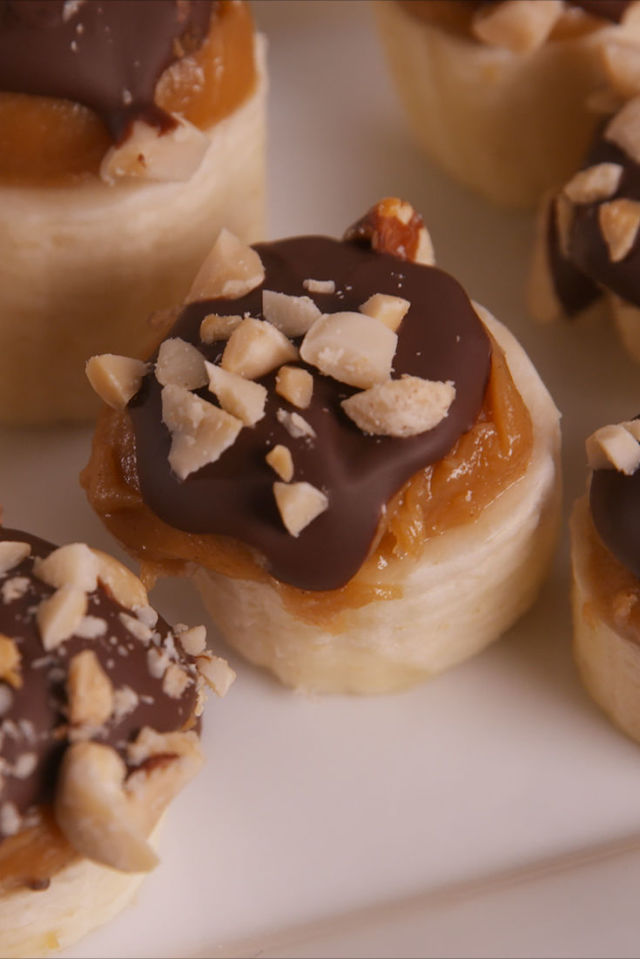 - Line a large baking sheet with parchment paper. In a medium bowl, combine caramel sauce and peanut butter and whisk until well combined. Spread a small amount of the caramel mixture onto each banana slice then place on baking sheet.